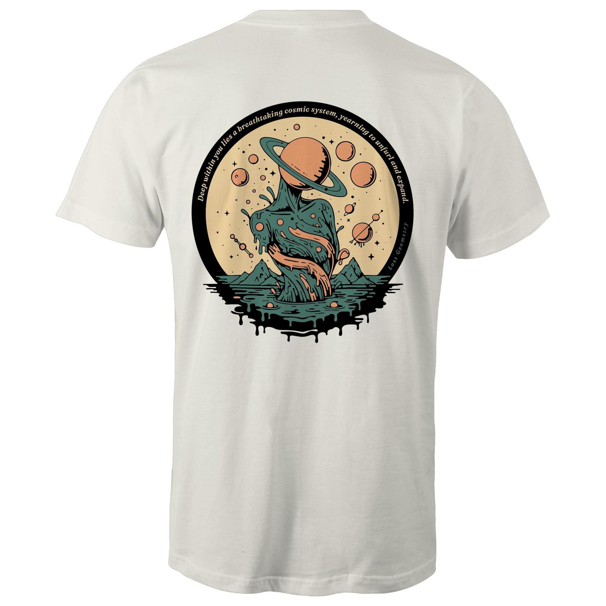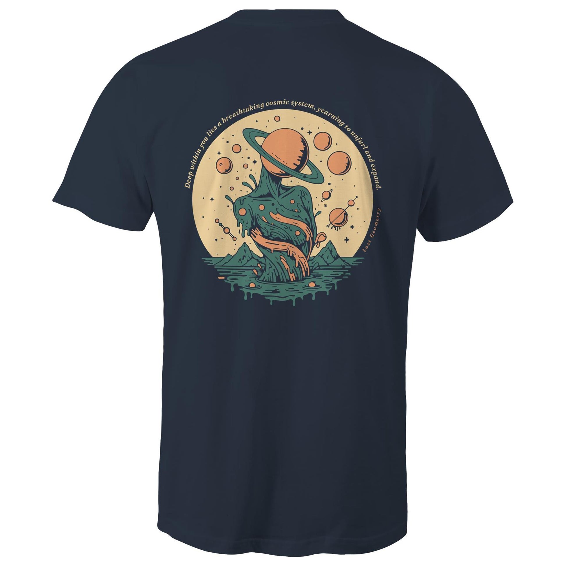 Spiritual awakening often feels like an internal cosmos revealing itself, and this consciousness expansion tee captures that profound experience. Psychedelic art shirts featuring a flowing water-like form rising from abstract depths, surrounded by distant mountains and orbiting worlds, represent the expansion that happens when you connect with larger forces moving through your life.